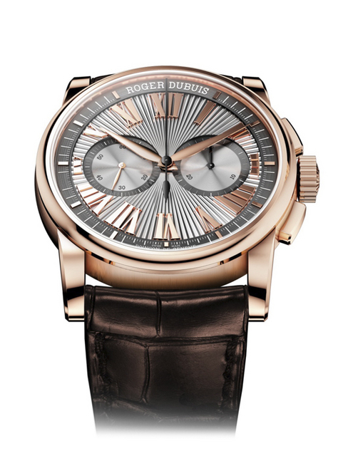 ROGER DUBUIS羅杰杜彼嚴守著為傳統帶入現代風格的慣例,並且將同色搭配與顔色對比兩種做法結合在一起,不僅將它們展現在此手錶錶圈、分鐘刻度環圈和Guilloché鐫刻飾紋當中,也發揮於計時碼錶、刻標和數字的設計之上。這些屬於古典製錶的典型設計元素被以嶄新的當代形式進行詮釋,表達出ROGER DUBUIS羅杰杜彼的獨特藝術眼光,同時也提高了訊息的識別性和視覺的吸引力。這款計時手錶採用造型大膽的長方形按把和佈滿凹槽線條的錶冠,展現出鮮明的陽剛性格,卻又以溫暖的玫瑰金色調、優美的圓弧曲綫以及長秒針的葉形尾端帶來柔和的色彩。