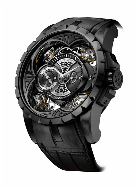 Excalibur Quatuor手錶堪稱ROGER DUBUIS羅杰杜彼的創意力作,超越了奠定品牌傳奇的經典特質。從第一稿設計草圖到2014年在SIHH日内瓦國際高級鐘錶展當中展出的黑色DLC鈦金屬錶款,此手錶巨製凝聚了錶廠的所有專業技藝於一身。