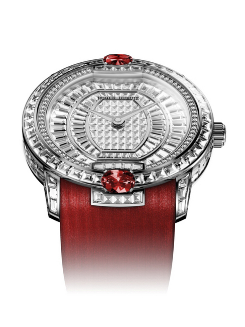 每顆寶石若非被擺置在最有利、最能彰顯其優點的方位,即使是最細緻優質的寶石也無法散發出最明亮的光輝。此款傑出的手錶展現著ROGER DUBUIS羅杰杜彼在珠寶領域的精湛技藝,採用了三種以上的不同鑲嵌方式。中央錶盤和錶環採用傳統的隱藏式鑲嵌以遮掩鑽石之間的白金,使視覺焦點全然集中於寶石的閃耀光彩之上。環繞著長角階梯切割鑽石的爪式鑲嵌,以金匠精巧手工製成的四鑲爪底座高高托舉著鑽石,使其傲立於手錶的其它部位之上。呈現著高級訂制時裝質感的紅色緞面錶帶為此手錶帶來獨特而細緻的觸感。由於純正的緞面錶帶非常纖細脆弱,本錶款額外附贈緞面加工的織布錶帶,以提供客戶日常配戴使用。