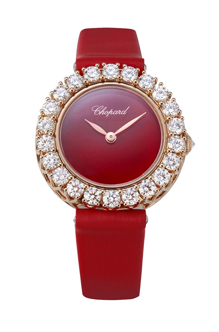 18K玫瑰金材質/手動上鍊機芯/時、分顯示/錶款鑲鑽約重2.35克拉/紅色瑪瑙面盤/藍寶石水晶鏡面/防水30米/參考價:NT$ 1,121,000