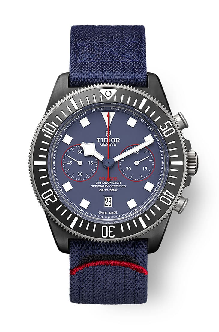 帝舵頂級潛水錶系列Pelagos,旗下尚有與法國海軍特種部隊共同開發的專業規格系列Pelagos FXD。這個子系列特色在於結構堅固,採用固定式(FiXeD)錶帶桿設計,目前其除了基本的三針款,還有計時碼錶、兩地時間等進階功能可選。以符合這次主題的型號M25807KN-0001為例,它是為了紀念TUDOR與阿靈基紅牛帆船隊(Alinghi Red Bull Racing)合作所打造的作品。手錶融入了帆船隊標誌性的藍色和紅色,展現出頂尖帆船隊的熱血激情活力。