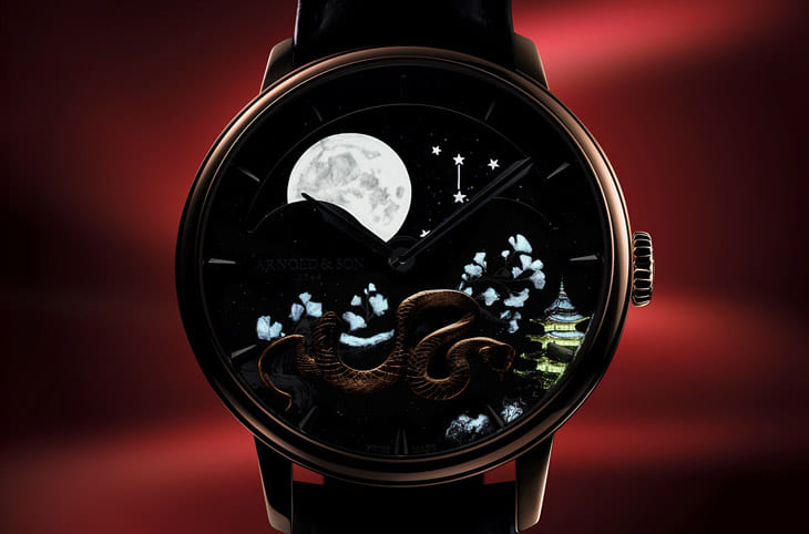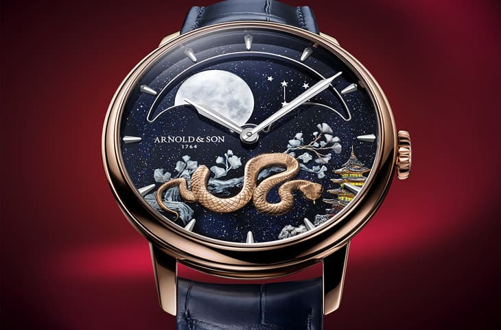 ARNOLD & SON近年固定有推出生肖錶的習慣,而且他們家生肖錶常以Perpetual Moon為基礎,善用大型天文月相扇形視窗以外的空間佈置每一年不同的生肖主題。2025年邁入木蛇年,亞諾錶繼續選擇用18K玫瑰金打造最新的Perpetual Moon恆久月相蛇年錶,這款又是限量數極少的逸品,即使它的面盤格局已經為人所熟悉,但是融入蛇年生肖主題後,頓時又讓手錶富有新意,細細品味面盤圖案的細節,對於其散發的優質品味感受特別強烈。