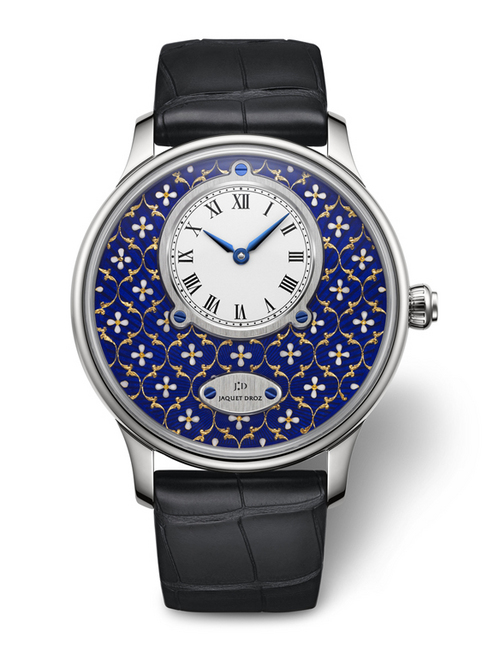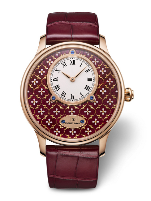 雅克德羅金箔雕花琺琅時分小針盤手錶,將來自18世紀的古董金箔葉點綴於大明火琺琅面盤之上,為這款手錶贏得「古董蕾絲」之美譽,亦成就了品牌Paillonnée琺琅工藝之秘技。