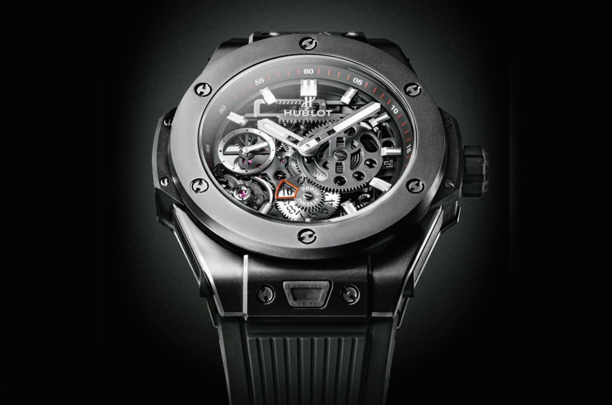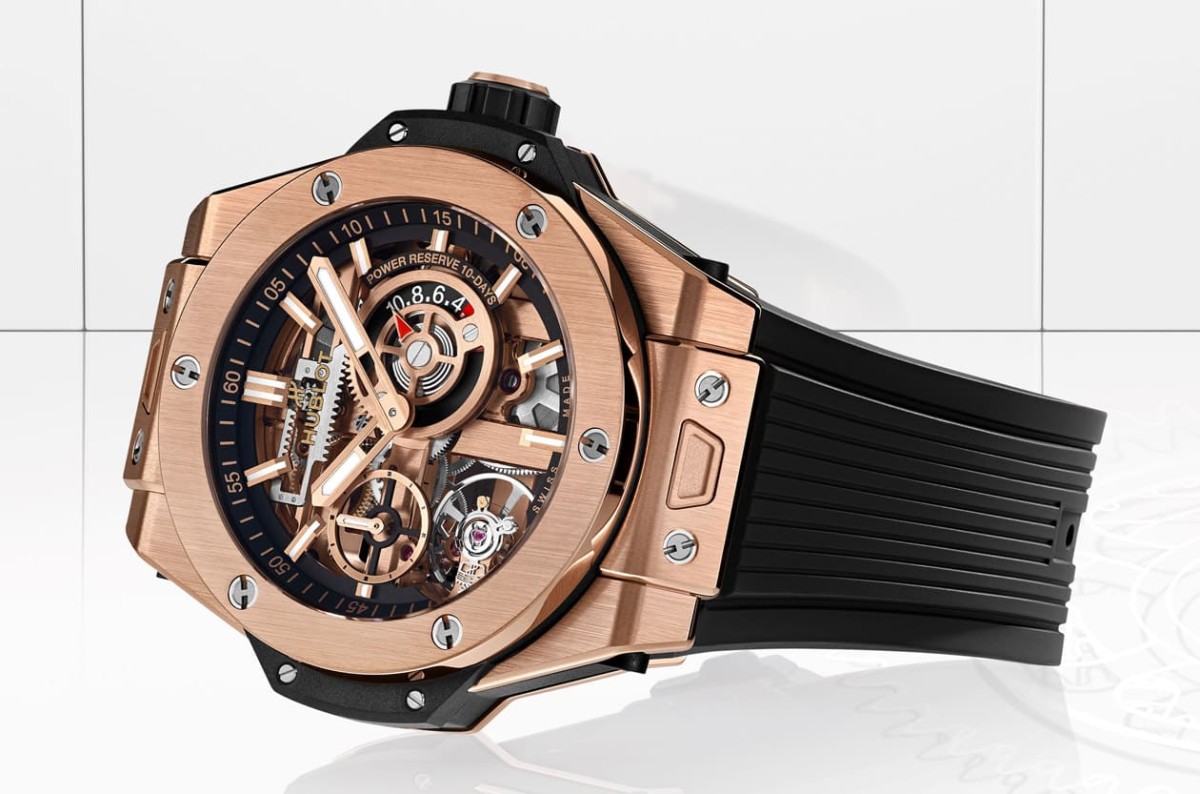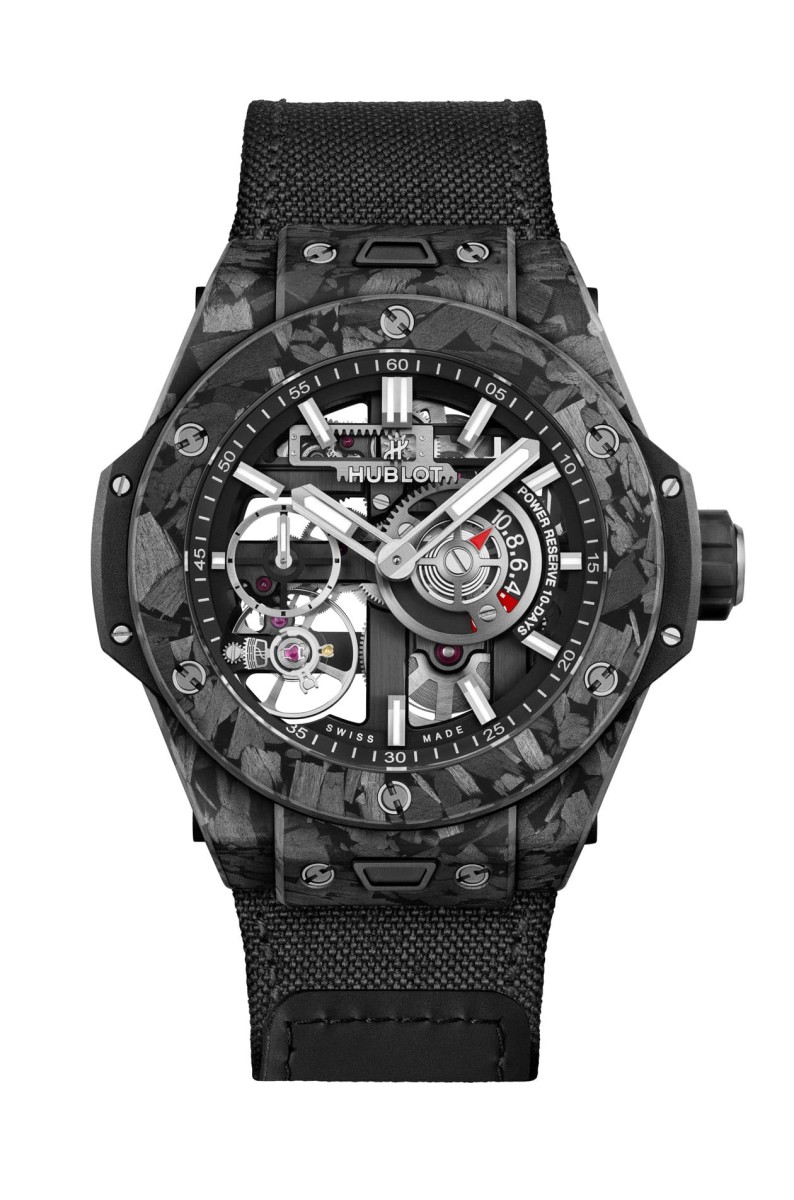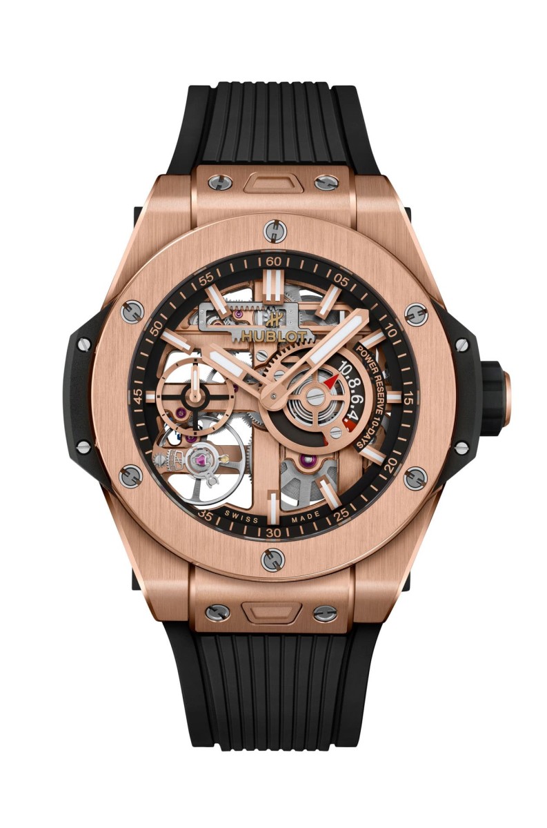 新一代Meca-10機芯導入了宇舶近年所開發的專利微調系統,其將傳統快慢針改造成具有象徵HUBLOT的"H"字型結構,能精細調整游絲長短,藉以呈現準確時間資訊,至於矽質擒縱輪由於無需上油潤滑,能有效降低零件之間的接觸與磨損,既能確保機芯穩定運作又富有高抗磁性,力促腕錶在各種環境下常保精準耐用。