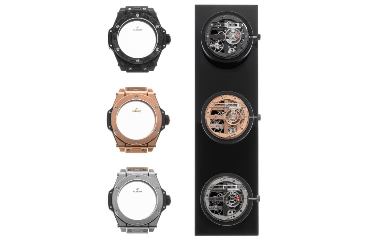 ▲新款Big Bang Meca-10腕錶分別有鈦金屬、皇金以及冰霜碳纖維材等三種材質,其機芯夾板與橋板的電鍍顏色與錶殼充滿彼此呼應的一致性。