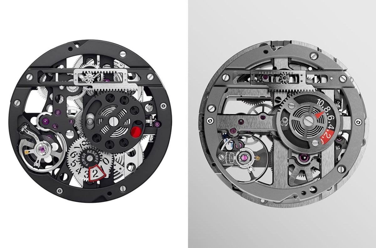 ▲左為第一代Meca-10機芯HUB1201、右為新一代HUB1205機芯,兩者創作概念相同,不過細節呈現出與時俱進的改造,例如動力儲存顯示由兩個整合為一個。