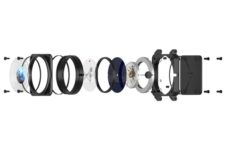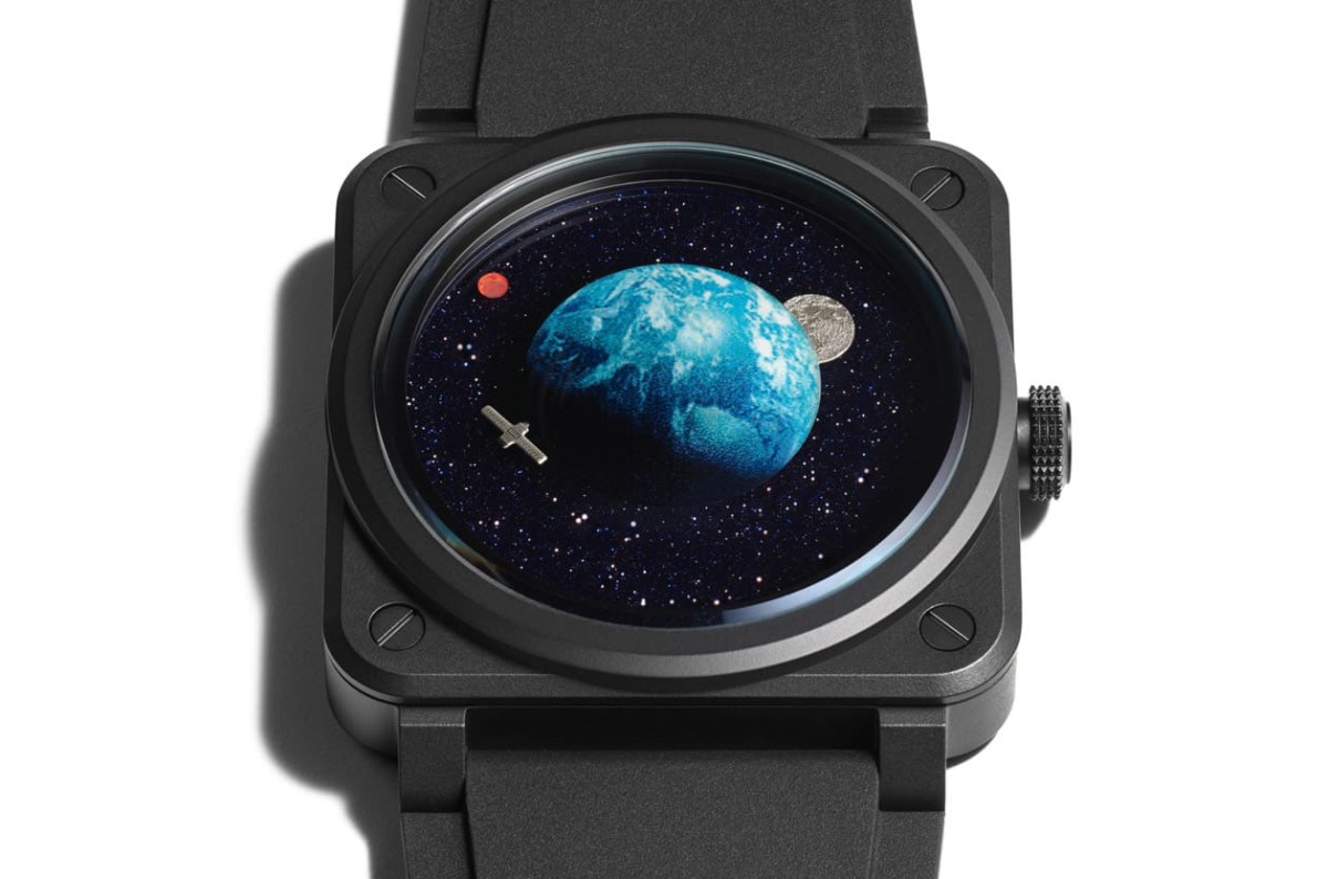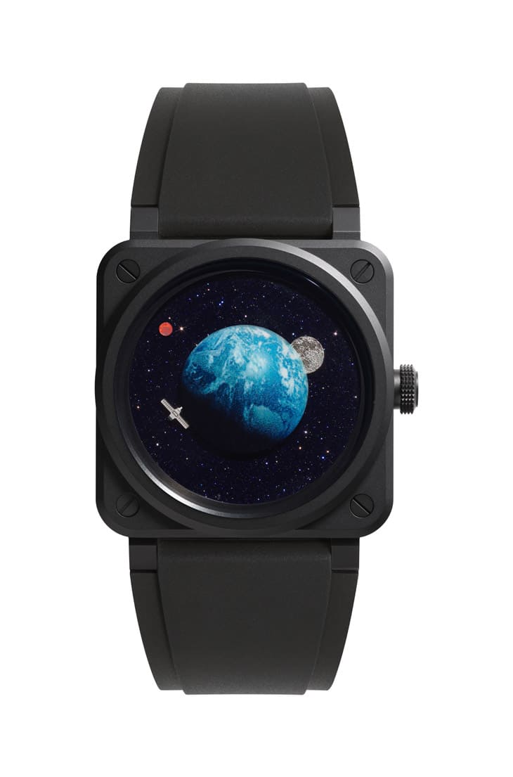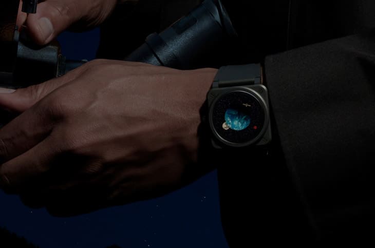 為了要製作出手錶面盤,BELL & ROSS先在藍寶石水晶下印好圖案,而地球圖案部分下方則是做成圓拱型,使它能和印好的圖案順利搭配,以便呈現出擬真立體感,火星圖案本身是印在砂金石圓盤上的藍寶石轉盤上,至於月球和衛星還是有實體軸心延伸出的指針變化型態,其中牽涉到比例要精準拿捏,才能讓這些星體與衛星取代指針的作用。