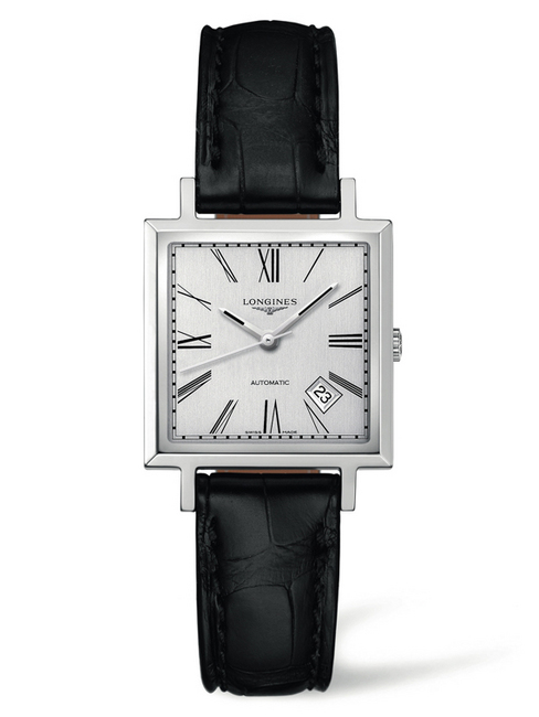別緻而前衛的浪琴表經典復刻系列1968方形復古手錶(Longines Heritage 1968)是穿梭時光的永恆之作。這款26x26毫米的方形精鋼手錶配備L595自動上鍊機芯。灰色拉絲錶盤上印有精美的黑色羅馬數字以及外部的一圈刻度環,4:30位置設有梯形日期視窗。時針與分針上分別繪有一條黑色線條,並配以黑色短吻鱷魚皮錶帶。