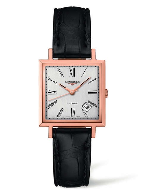 別緻而前衛的浪琴表經典復刻系列1968方形復古手錶(Longines Heritage 1968)是穿梭時光的永恆之作。這款26x26毫米的方形玫瑰金手錶配備L595自動上鍊機芯。灰色拉絲錶盤上印有精美的黑色羅馬數字以及外部的一圈刻度環,4:30位置設有梯形日期視窗。時針與分針上分別繪有一條黑色線條,並配以黑色短吻鱷魚皮錶帶。