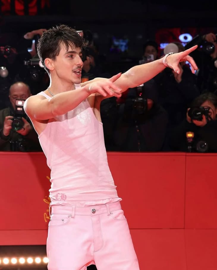 「甜茶」Timothée Chalamet近日為宣傳新片《巴布狄倫:搖滾詩人》前往德國參與第75屆柏林影展,他在出席影展時帥氣穿了一身粉紅走紅毯演繹他個人偏好的Y2K風格,例如粉紅色連帽外套、粉紅色背心、粉紅色長褲,連靴子也是粉紅色的,這種全身粉紅的休閒裝扮雖然不算正式,但在紅毯上穿絕對引人注意。