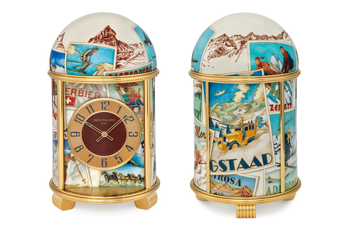 第二款焦點則是面向羅納街展區的20191M-001「滑雪往事」圓頂座鐘,其同樣採用掐絲琺瑯工藝,輔以微繪琺瑯潤飾。這件獨一無二的作品靈感源自一張瑞士滑雪勝地的老海報,向阿爾卑斯山旅遊業的黃金時代以及瑞士平面設計致敬。鐘身上描繪不同圖案(尤其是字體)的輪廓,需要使用長達16.07公尺(38.93克)、三種不同寬度的金線。為了呈現一股懷舊色彩風情,琺瑯師運用了多達45種琺瑯顏料,主要為透明琺瑯,但也包含一些半透明或不透明琺瑯。細節的精緻之處在於7種顏色的微繪琺瑯,包括環繞圓頂山脈飾帶的棕色琺瑯。每塊琺瑯板都經過770°C的溫度燒製12次,製作過程相當耗時費工。鐘盤飾有放射狀刻紋的時標環上設有海軍藍漆繪阿拉伯數字時標,搭配造型如同滑雪板、尖端亦塗有海軍藍漆的指針清楚顯時,鐘盤中央為真皮材質,用意是要呼應山上小木屋的舒適氛圍,此處尚有黃金微型貼花勾勒出百達翡麗的標誌。此款座鐘搭載17''' PEND機械機芯,可透過電動馬達輔助上鍊。