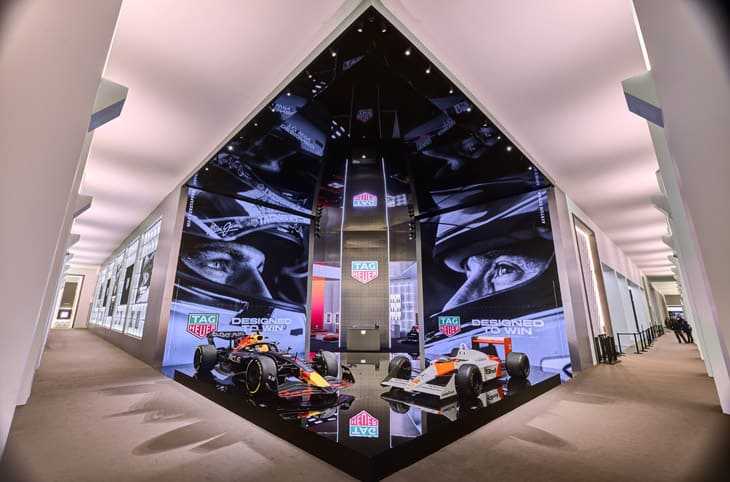 ▲泰格豪雅2025年Watches & Wonders錶展的展區連結其與F1賽車的淵源,門口放置現役和傳奇冠軍車手座駕。