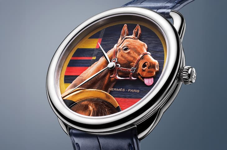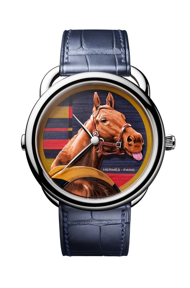 錶錶重現了Dimitri Rybaltchenko設計的Rocabar de rire絲巾圖案,其上描繪的是一匹頑皮馬兒形象,這隻喜愛扮演搞笑角色的溫柔動物,經由手工雕刻和手繪的動偶裝置詮釋變得更栩栩如生,透過9點方向按把的彈簧機構驅動,按下按把時,馬兒會伸出舌頭,逸趣橫生。色彩斑斕的馬鬃毛鑲嵌條紋背景,突顯了馬兒的生動輪廓。面盤的製作過程需要極度的耐心和靈巧的手藝,鐫刻工藝師先用傳統的雕鑿刀具精雕馬匹圖案,呈現立體效果,微繪工藝師則層層塗繪顏料並經過窯燒,逐步呈現出獨特的色彩與細節;最後,鑲嵌工藝師精心挑選並鑲黏不同顏色的駿馬鬃毛。錶款搭載愛馬仕自製H1837自動機芯,透過透明底蓋可以欣賞到機芯的精細打磨和H字母雕飾。
