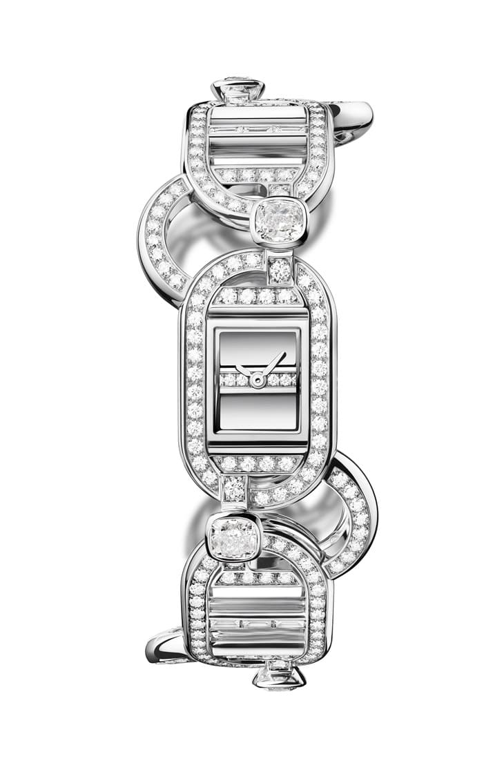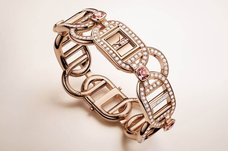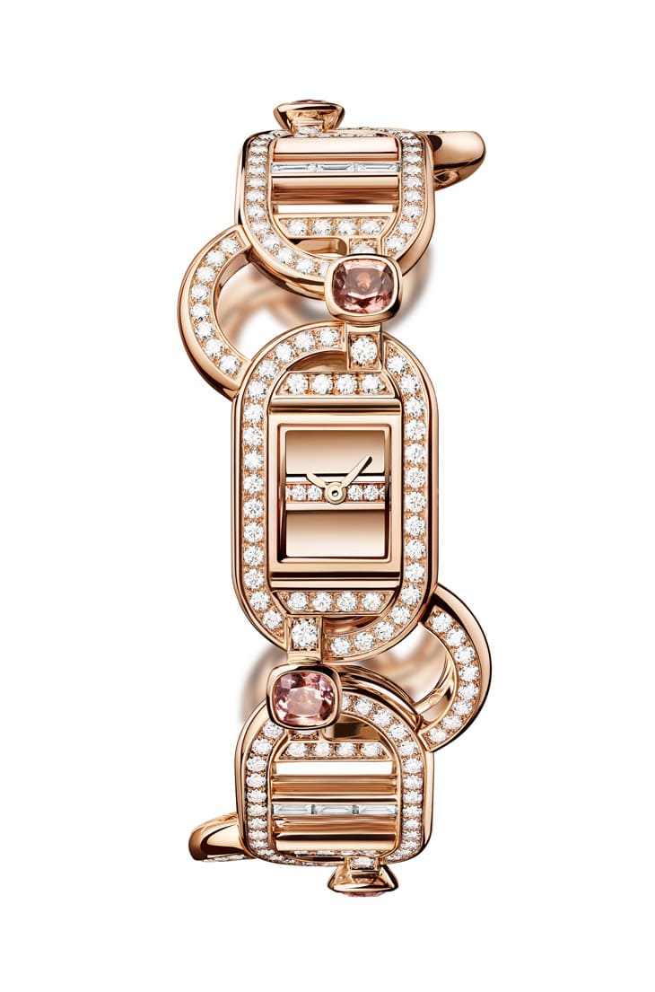 此系列則以愛馬仕深植人心的Chaîne d’ancre錨鏈元素為靈感,激發出全新的手鍊式手錶與胸針時計。手鍊式手錶擁有複雜的製作工藝,外形如波浪般起伏,由於錶殼與鍊帶造型融為一體,時間顯示帶點神祕感,此系列的手鍊式手錶分別有玫瑰金或白金款式,部分款式鑲嵌明亮式切割鑽石,主石可以是包鑲枕型切割的紅色碧璽或鑽石。胸針時計則是對歷史悠久配飾的現代演繹,既可單獨佩戴,又可搭配皮繩變作吊飾,致敬愛馬仕的皮具與鞍具傳承。胸針款式同樣具備玫瑰金或白金材質,並鑲嵌明亮式及矩形切割鑽石,部分款式飾有包鑲枕型切割的藍色或紅色碧璽。Maillon libre系列富有創意造型且精巧珍貴,讓優雅風度與時間顯示可以完美合璧。
