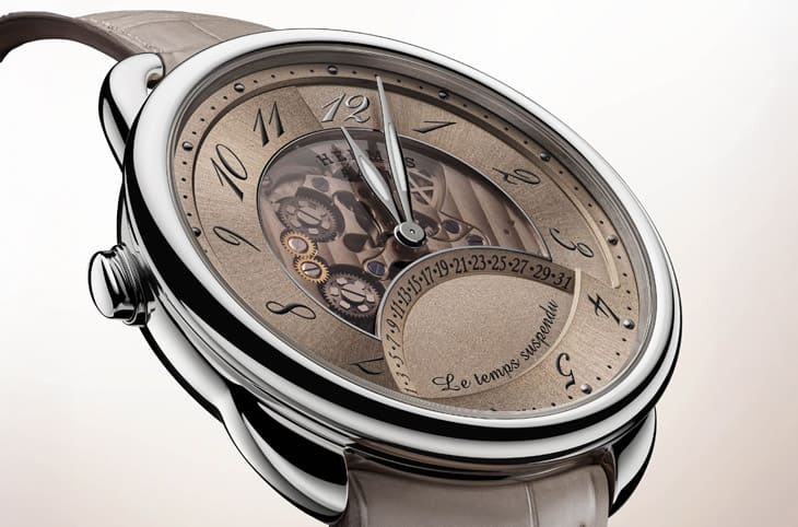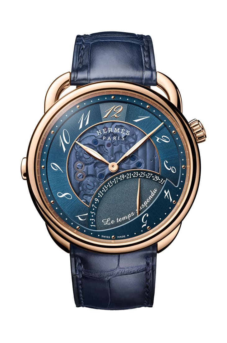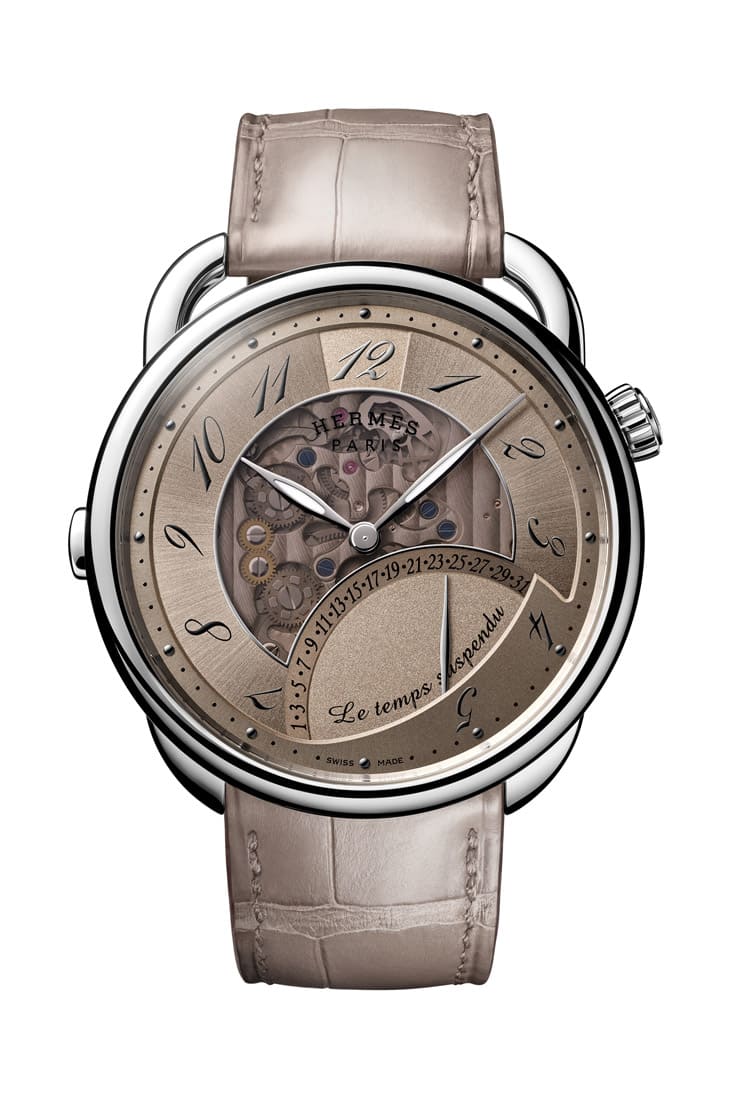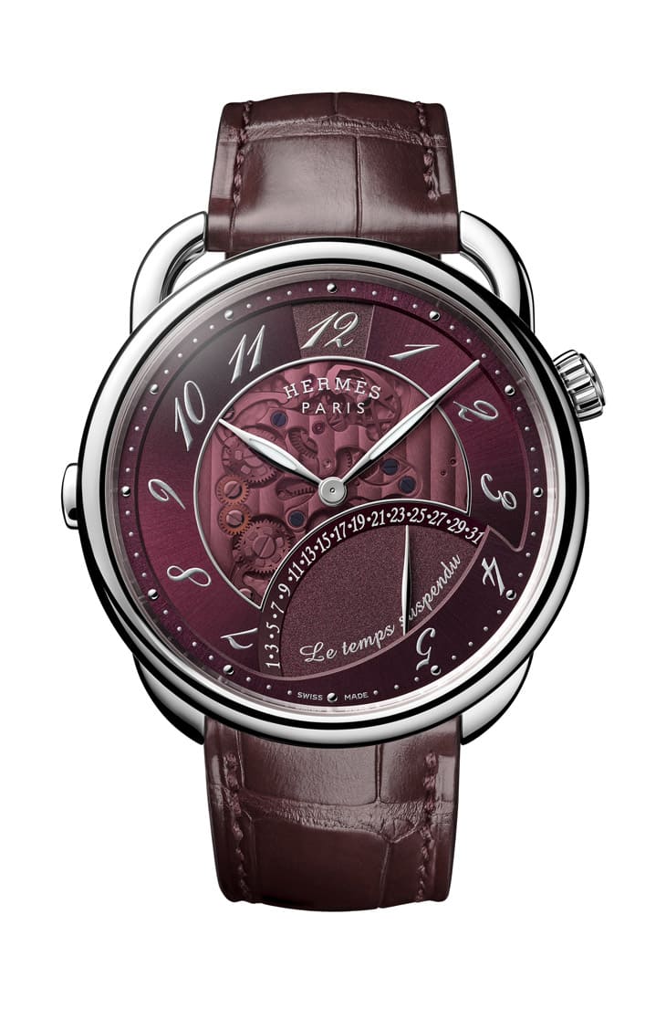 Arceau Le temps Suspendu時間暫停手錶睽違一段時間後於2025年迎來重新演繹,在微微降至42mm的纖薄錶殼中,鏤空面盤隱約展露出獨樹一幟的「時間暫停」模組,與該模組搭配的是愛馬仕H1837機芯,透過透明底蓋清晰可見其精密的打磨裝飾。新款Arceau Le temps Suspendu分別有白金或玫瑰金錶殼,並搭配三種放射紋裝飾的面盤顏色,包括藍色、Brun Désert(沙漠棕)以及Rouge Sellier(馬鞍紅)。這款手錶的功能包括時、分、逆跳日期顯示以及「時間暫停」功能,佩戴者可以透過位於9點方向的按把啟動或停止指針的運行,使時間顯示暫時靜止,面盤的「時間暫停」區域位於12點方向,指針則覆有Super-LumiNova®夜光塗層,確保在光線不足的環境下也能清楚閱讀時間。