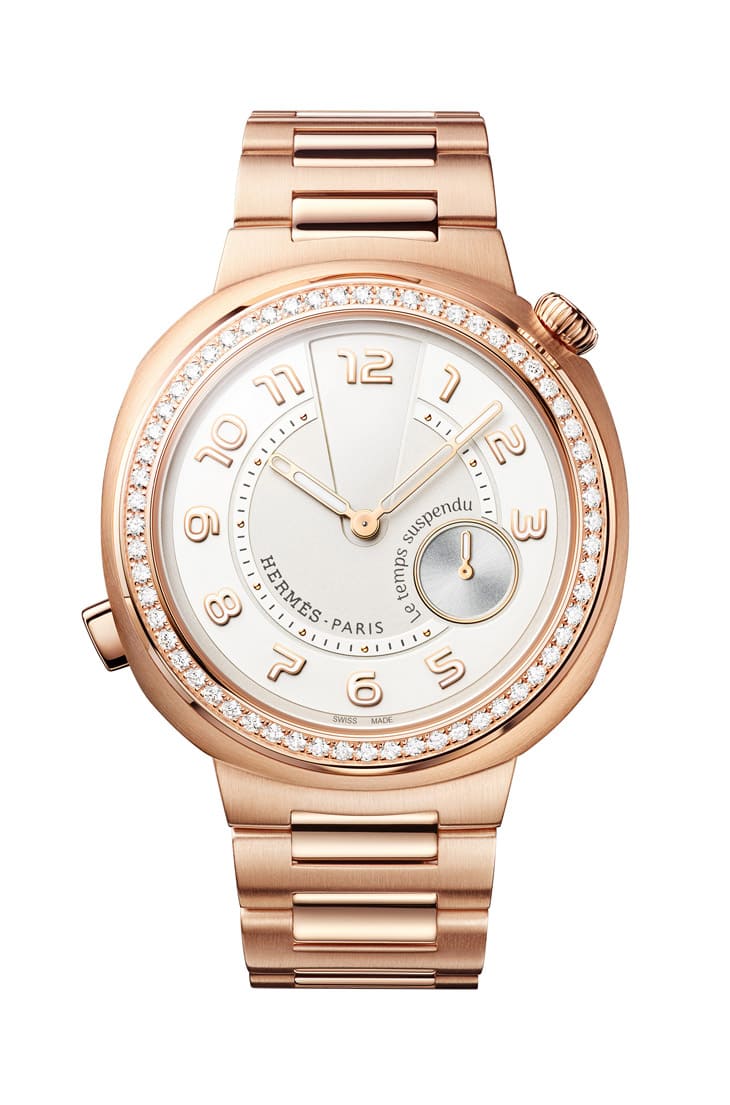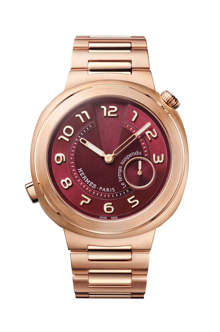 愛馬仕首次將「時間暫停」功能移植進HERMÈS Cut系列,錶款採用39mm的玫瑰金錶殼,展現出俐落線條和大膽的幾何造型,搭載由愛馬仕H1912機芯驅動的時間暫停模組,釋放出輕鬆歡趣的魅力。值得一提的是,其小秒盤採用逆時針旋轉的設計,更添一分諧趣特質。HERMÈS Cut Le temps Suspendu手錶的創作概念是在顛覆常規,賦予時間一股幽默特質。手錶推出多種款式,其中包括紅色或白色面盤,另有錶圈鑲鑽的奢華版,手錶與Arceau Le temps Suspendu相似,它也具備時、分顯示,並可透過按把啟動和停止指針的運作。
