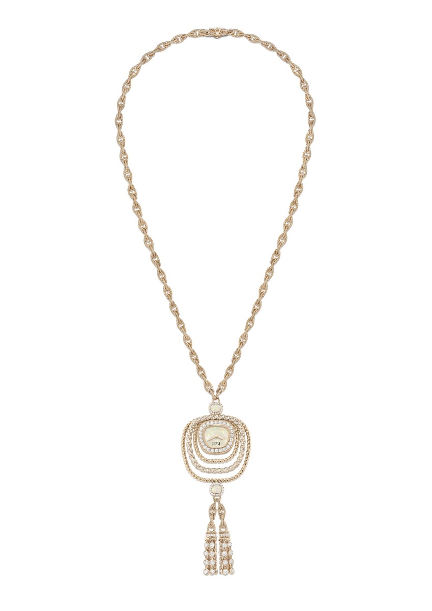 ▲SIXTIE系列 18K 玫瑰金白色蛋白石鑽石長項鍊錶