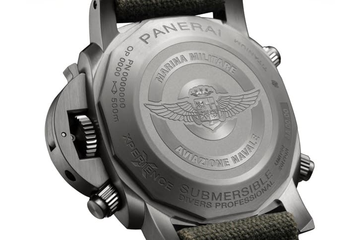 ▲鈦金屬底蓋刻上義大利海軍航空兵部隊的專屬徽章圖案,同時手錶的限量編號也刻印於底蓋邊緣,至於體驗版英文字樣則是提示它能與錶主共同參與航空軍事訓練的特殊安排。