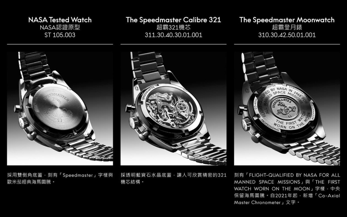 接著是超霸321機芯復刻版,這款可以說是現代向經典致敬的代表。它的靈感就來自ST105.003,但最大亮點在於321機芯重出江湖。這枚導柱輪計時機芯原本早在1969年停產,結果歐米茄在2019年真的把它復刻出來,而且還是用電腦斷層掃描分析過阿波羅17號太空人Gene Cernan戴過的原錶,復原程度幾乎百分百。外型上,它維持原本對稱直耳的設計,錶背還改成藍寶石透明底蓋,讓人可以大方欣賞這枚傳奇機芯的運作。這一點,對愛好機械錶的藏家來說根本是夢幻配置。