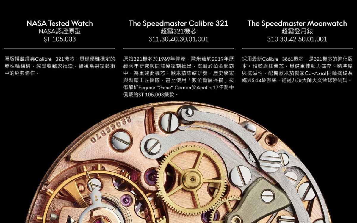 最後是你現在到錶店上能看到的登月錶,也就是搭載3861機芯的現行版Speedmaster Moonwatch。這是根據Apollo 11任務中使用的第四代超霸為藍本打造的,所以外觀會有點不一樣,例如錶徑拉大到42mm,錶殼也從對稱改為不對稱設計,按把兩側多了護肩,讓整體更有現代感也更耐用。3861機芯可以說是321機芯的進化版,不只是導柱輪結構,還加上了Co-Axial同軸擒縱、Si14矽游絲與超高抗磁力,還通過大師天文台認證,規格非常強悍。對日常佩戴來說,這款兼具科技與經典,實用性一流。