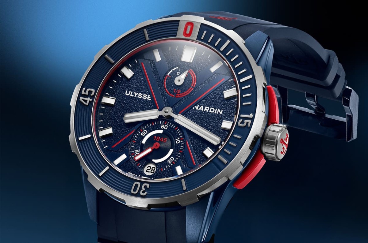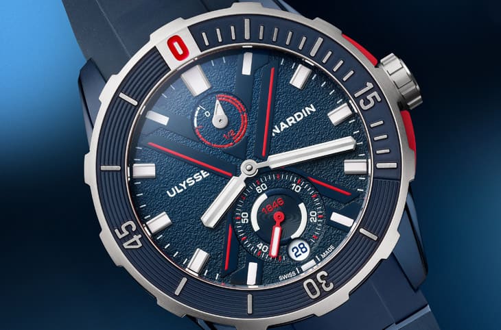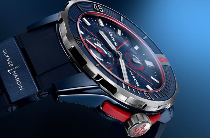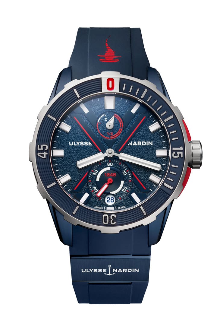 設計上,這款潛水錶也毫不馬虎,錶殼採用藍色PVD鈦金屬打造,既輕盈又耐用,加上300米防水性能,無論是來真的下水潛水,還是日常戶外活動都能應付得來,它的單向旋轉錶圈與清晰的夜光指針時標,專業潛水錶該有的條件一樣不少,實用性滿分。面盤6點方向的小秒盤設有夜光指針與內嵌式日期窗,設計巧妙又不影響整體視覺感受,無論白天黑夜,讀時都非常直觀;面盤整體採深藍色調,與錶殼呼應,加上紅色細節既可以豐富視覺層次,也為整體造型添上一筆活潑與野性的味道。