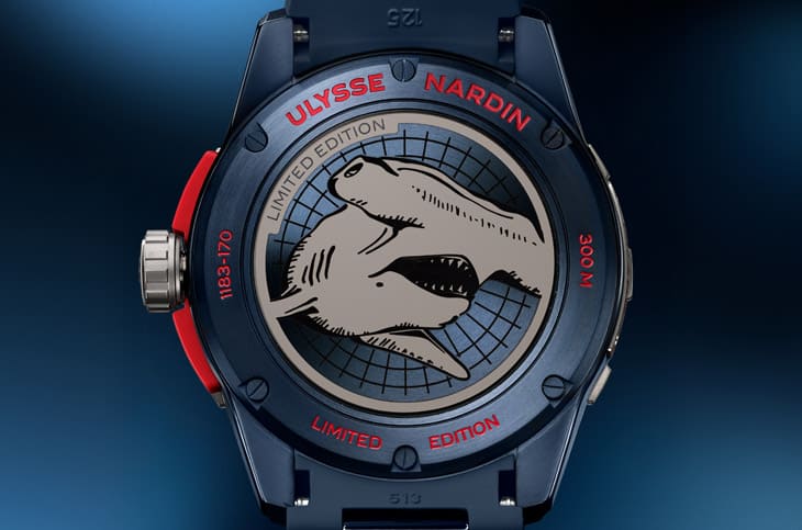 ▲藍色PVD鈦金屬錶背鐫刻錘頭鯊圖案,細節以紅色點綴呈現型號、限量編號與防水深度,既展現設計美感,也呼應錶款保育主題的核心精神。