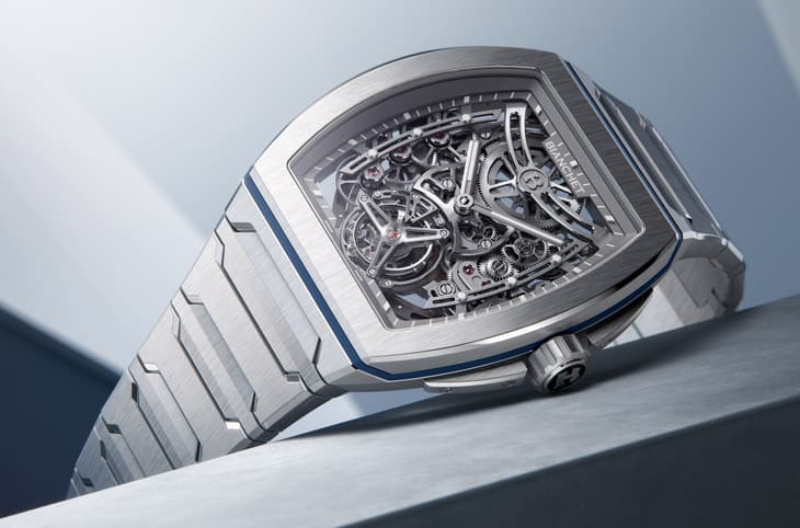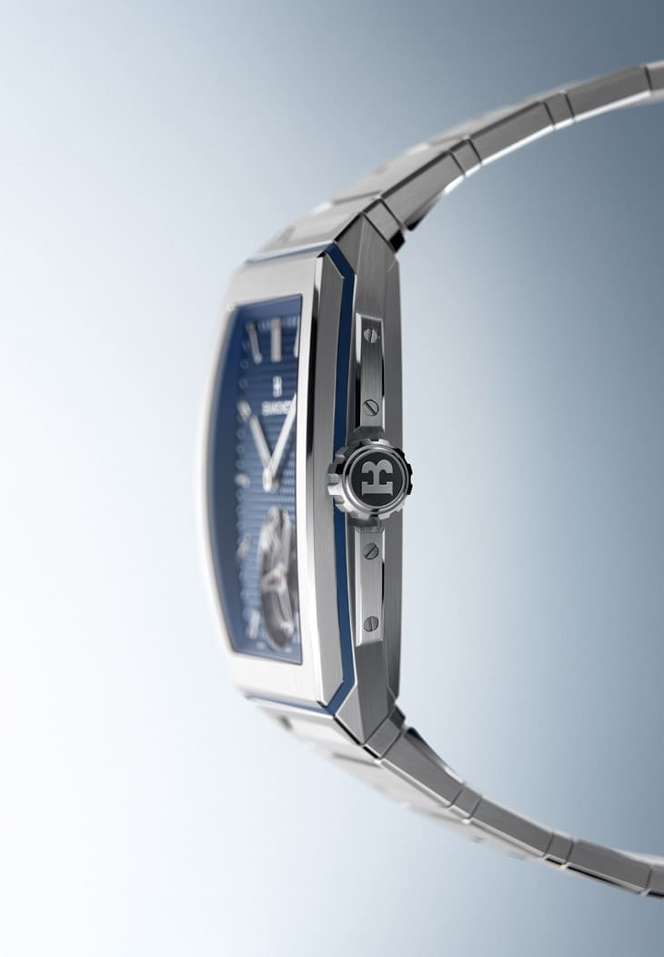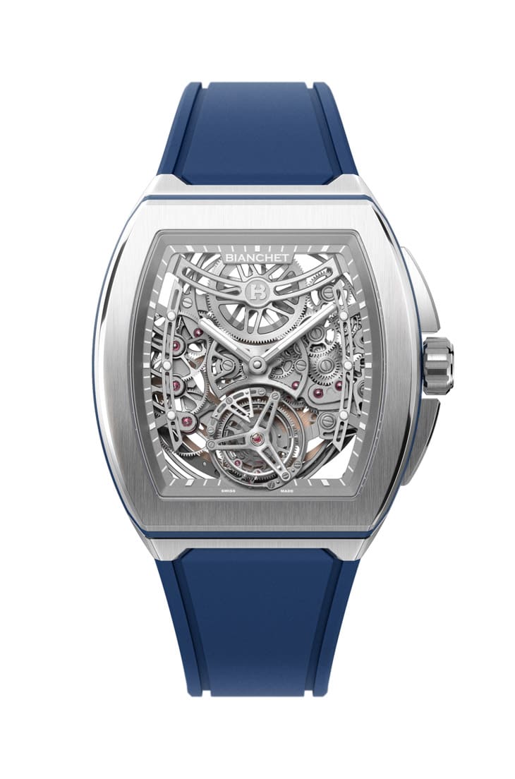 而UltraFino系列還有個讓人驚喜的新元素之一,是BIANCHET首次為酒桶形手錶設計的整合式金屬鍊帶,這並不是單純的造型選擇而已,而是對設計和工藝的一次大考驗。錶款配置的鍊帶以鈦金屬製成,曲線能與錶殼無縫銜接,不僅佩戴舒適,整體視覺感受相當協調,流露出一種渾然天成的工業藝術感;而若偏好更內斂雅致的運動風,UltraFino也還有天然橡膠錶帶版本可選,佩戴感受更為俐落便捷。