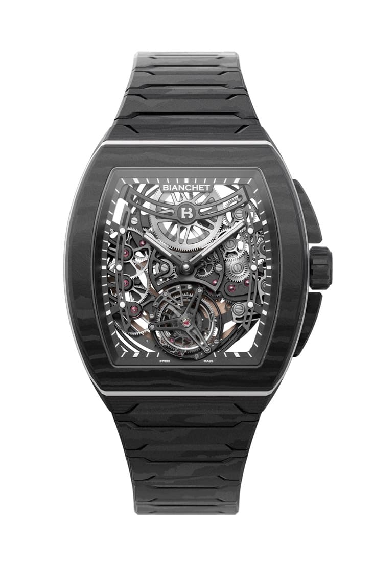 至於如果你喜歡更進一步的材質創新,UltraFino Carbon版本則是不容錯過的進化型選擇。其以單體碳纖維壓製而成的錶殼與鍊帶,重量更輕、強度更高,搭配黑色PVD處理的UT01鏤空機芯,以及可選的紅、白、天藍橡膠墊圈裝飾,整體風格更具未來感與動感,專為講求個性與性能並重的錶迷而來,此外BIANCHET還會附上與墊圈裝飾顏色一致的橡膠錶帶,供錶主決定手錶的風格。