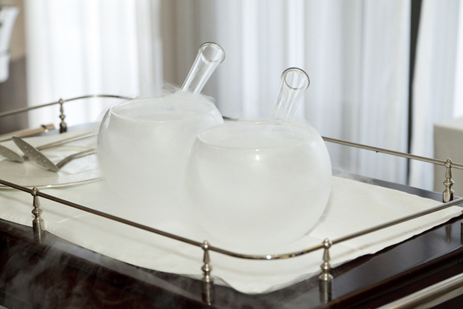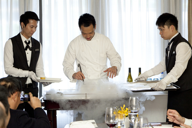 ▲ 帥氣主廚陳宣達現身,為現場貴賓親手處理熔岩白巧克力蛋糕的最後一道手續,剛出爐熱騰騰的蛋糕,快速經過液態氮冷卻,取出之後立刻送上桌前,蛋糕在餐桌上仍圍繞於煙霧之中,還未動口,眼睛就已經吃得飽飽的。