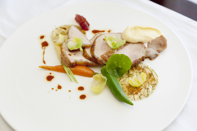 ▲ 主菜〈炙燒黑蹄豬附酒醋蕃茄配磯雪昆布燒〉,此道料理的主角黑蹄豬,放養於橡樹牧場中,以橄欖與野生香草為食,因此肉本身就具有特別的香氣,肉品的表面呈現大理石紋路,與其媲美牛肉口感,倍受饕客推崇。