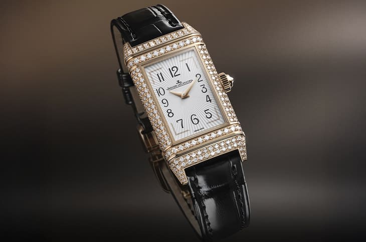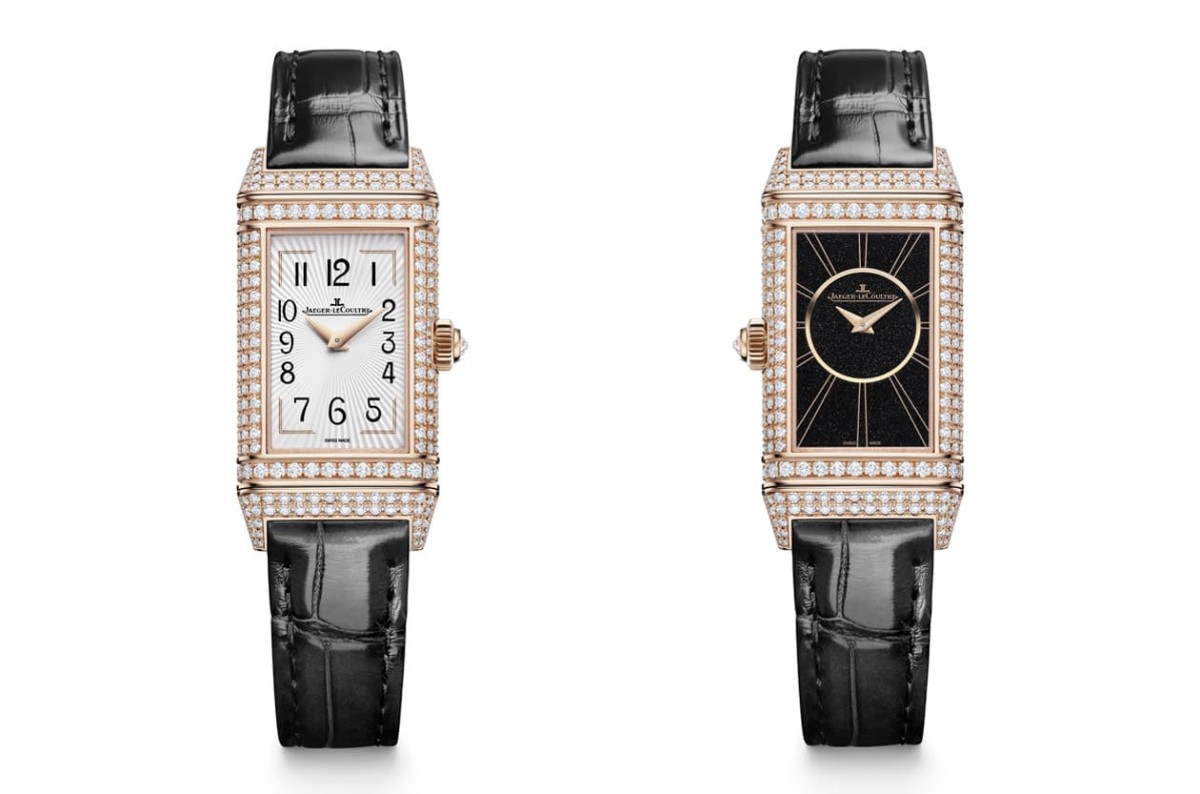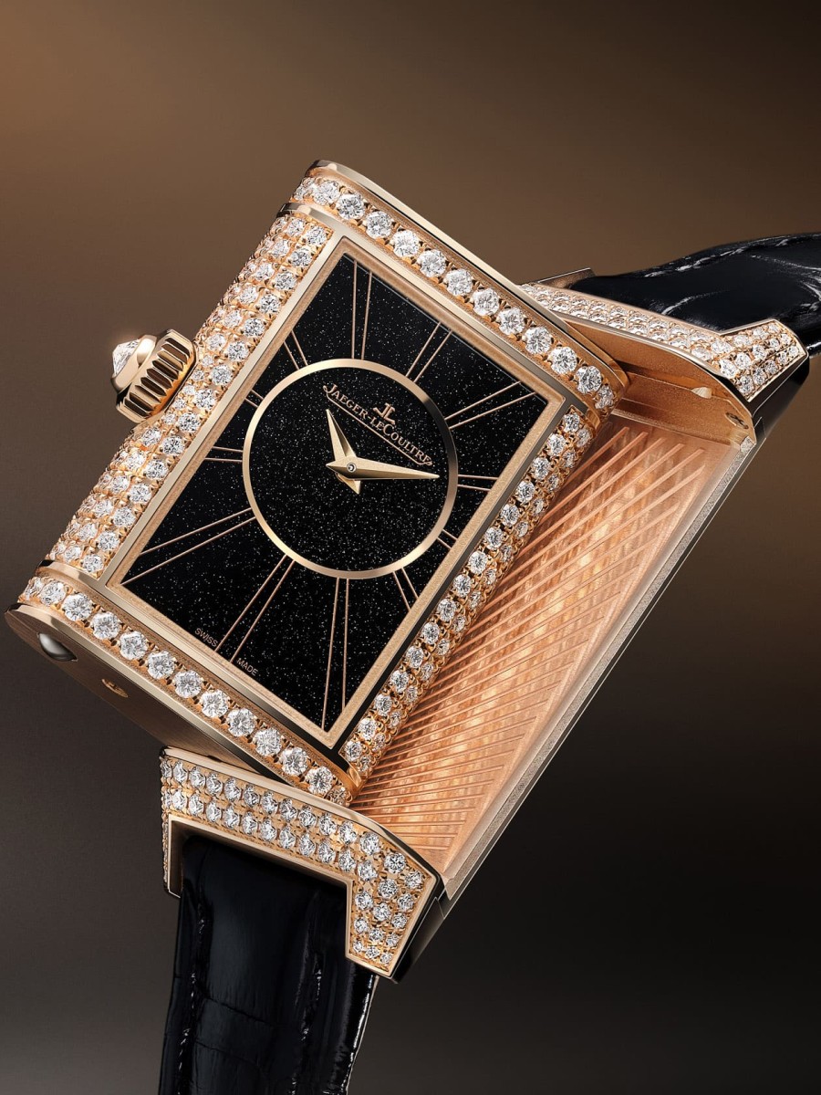 這只手錶採用玫瑰金材質打造長方形錶殼,上頭大範圍鑲嵌335顆白鑽,與錶冠上一顆倒置鑽石相互呼應,翻轉前後,會呈現兩種截然不同的風格:正面為銀白色太陽放射紋面盤,黑色阿拉伯數字時標搭配細緻金飾,展現日間的光明與優雅;背面則是漆黑如夜的面盤,隱隱閃爍金色亮片,彷彿一幕靜謐星空,流露出迷人的夜晚氛圍。兩組指針分別同步走時,宛如一位女性的兩種面貌——白晝的清澈與夜晚的深邃。手錶內部搭載的是積家自製的844手上鍊機芯,動力儲存可達50小時,這款機芯專為雙面指示功能設計,運作穩定、工藝精細,也體現了積家對女性時計的重視與誠意。