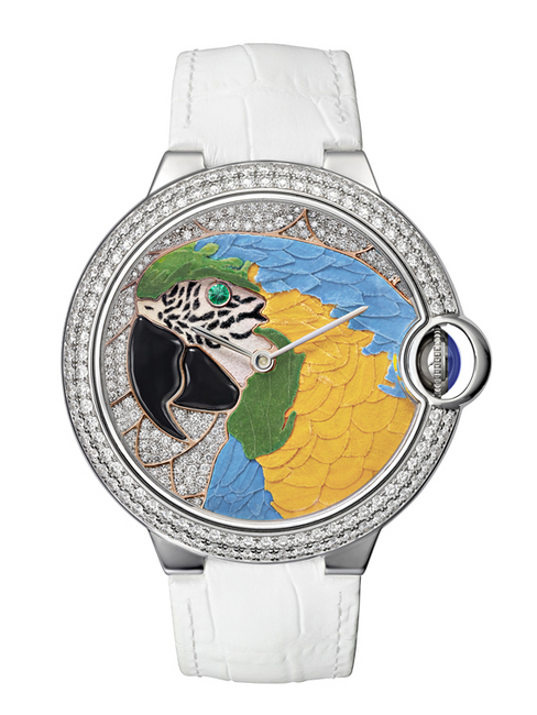 兩種工藝相輔相成,碰撞出全新的魔力,令手錶五彩紛呈——藍色和橘黃色的羽毛,深黑色的鳥喙、祖母綠色的眼睛,以及錶冠和錶盤底面鑲嵌的璀璨白鑽,這枚Ballon Bleu de Cariter手錶史無前例地呈現出如此繽紛的色彩