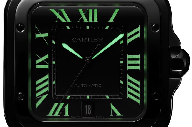 ▲卡地亞首次大範圍使用Super-LumiNova夜光,羅馬數字、指針與分鐘刻度在黑暗中清晰發光,辨識度提升。