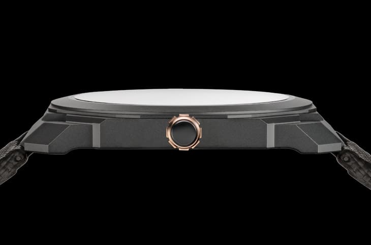 這只腕錶外觀令人聯想到1970年代Lotus F1賽車John Player Special的黑金塗裝,黑色DLC塗層包覆整個鈦金屬錶殼,使得原本已纖薄的5.95mm厚度,在視覺上更顯消瘦修長,而八角形結構仍舊是Octo Finissimo的靈魂,但在黑色霧面質感的處理下,幾何線條變得低調而內斂,以深邃神祕的氣質征服目光,這是「減法設計」的極致展現,也突顯寶格麗在美學處理上的敏銳。與全黑錶殼形成對比的,是18K玫瑰金錶冠與黑色陶瓷嵌飾,這抹暖色調巧妙地破除了單色的沉重,讓腕錶不至於陷入「全黑工具錶」的框架,而是展現義大利式的優雅,其正反兩面均採用藍寶石水晶鏡面,讓佩戴者能隨時欣賞內部機械的律動。此外DLC鈦金屬的特性也決定了腕錶既堅固又輕盈,寶格麗替其配置黑色橡膠錶帶與DLC鈦金屬針扣,使得這款外觀高冷的時計,意外地兼具日常舒適性。