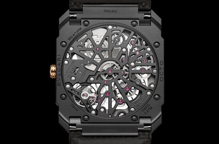 翻至背面,平整的藍寶石底蓋周圍由八顆螺絲固定,透過鏡面可見BVL 199 SK機芯的更多細節,機芯厚度僅2.5mm,震頻3Hz,由瑞士Le Sentier工坊製造,橋板邊緣經過細膩倒角與緞面修飾,即便在黑色PVD塗層下仍顯示出光影變化。這枚機芯是Octo Finissimo系列的重要支柱,以單一發條盒達成192小時動能,堪稱同類產品中的翹楚。