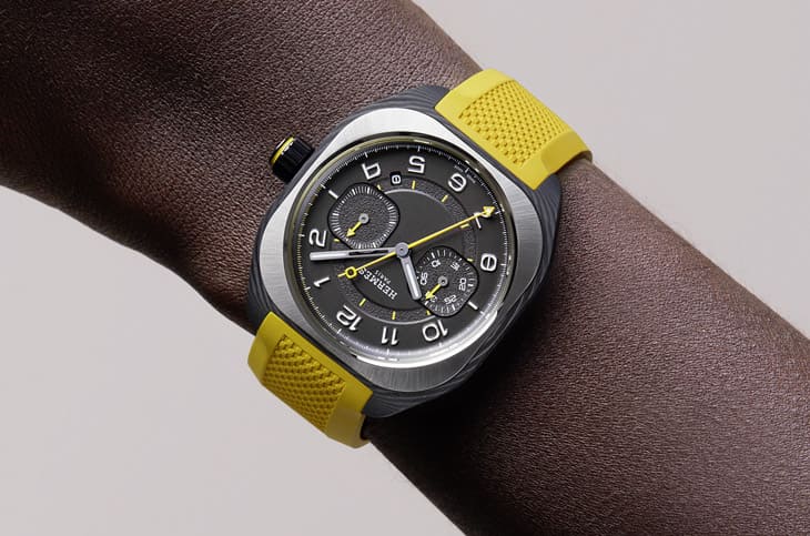 H08 Chronographe採單按把計時設計,這個按把巧妙整合於3點鐘方向的錶冠末端,環繞黃色線條,低調且直覺,操作順序依序控制啟動、停止與歸零。相比傳統計時碼錶,它保留了枕形錶殼的流暢線條,避免額外按把造成視覺突兀,也使手錶在造型上更統一。