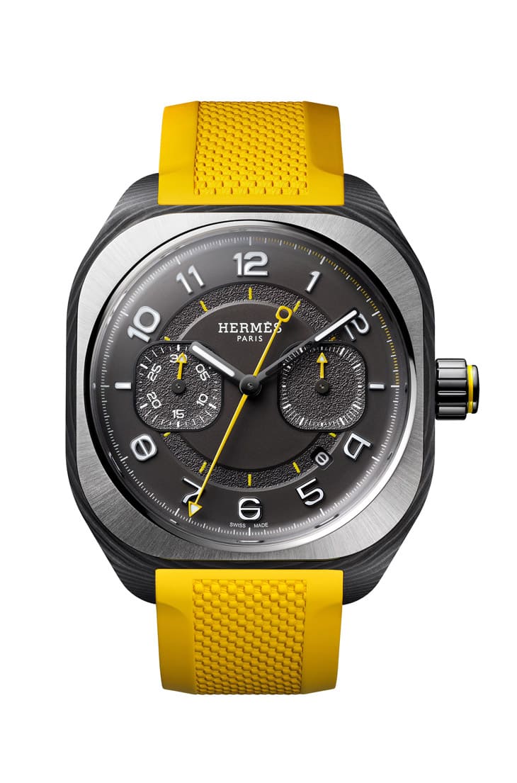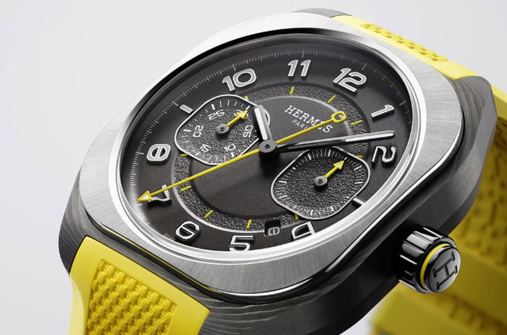 錶帶選用那不勒斯黃色橡膠,搭配黑色DLC鈦金屬摺疊扣,呼應整體設計色彩,使運動感與視覺吸引力兼具。HERMÈS Chronographe憑藉品牌背景、創意設計與少見的單按把機制,呈現兼具現代感與精密工藝的計時碼錶,既吸引高級鐘錶收藏家,也為運動錶帶來新鮮視角。