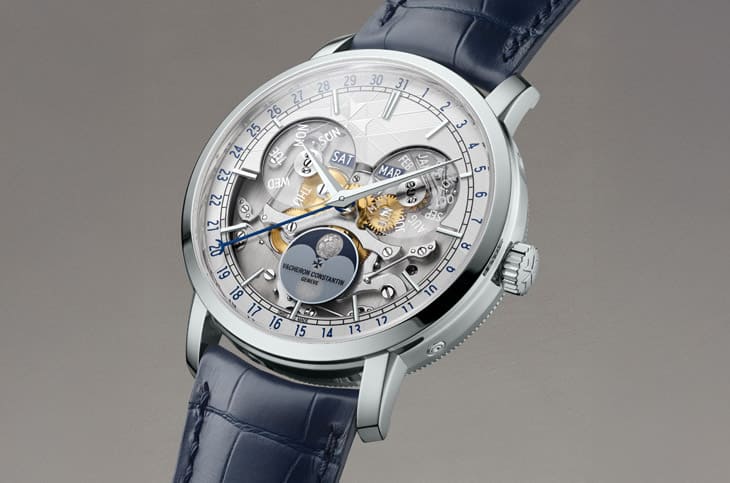這只手錶以鉑金打造,錶徑41mm,搭載品牌自製的2460QCL/270自動機芯,擁有日期、星期、月份與精密月相顯示,最迷人之處在於鏤雕面盤,透過鏤空設計可見312枚零件的細膩運作,視覺層次豐富卻不失優雅。藍色日期指針與藍寶石鏡面的搭配,讓時間閱讀清晰分明,這只手錶限量370只,是江詩丹頓為品牌270週年推出的紀念傑作。