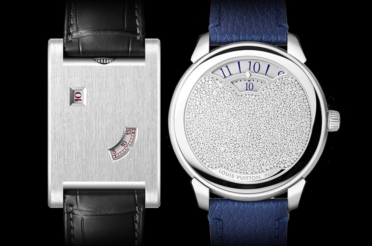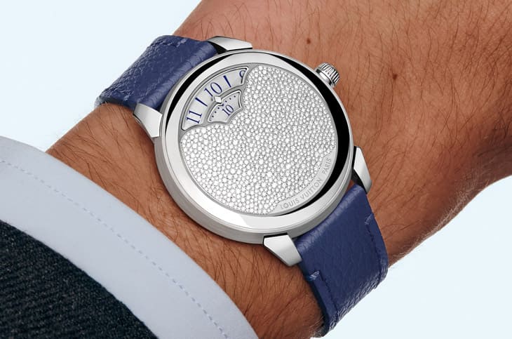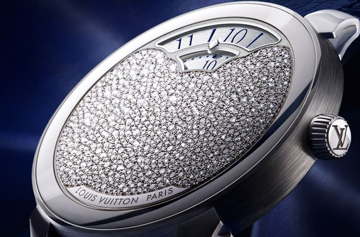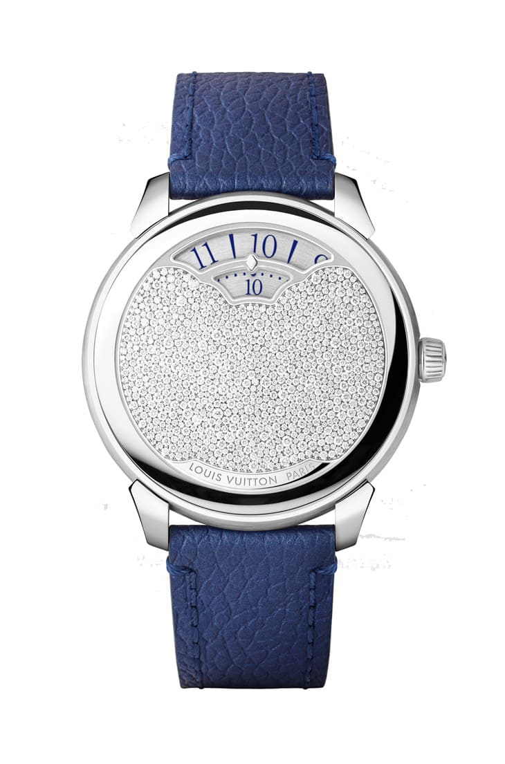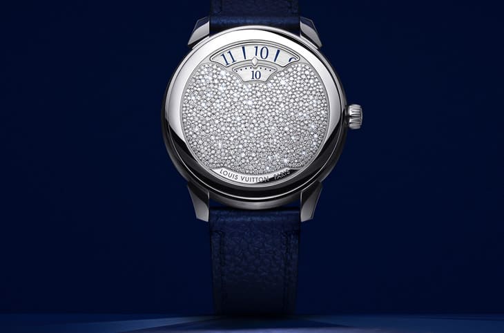 Tambour Convergence鉑金鑲鑽款整個正面由鉑金打底,再以雪花鑲嵌技法鋪滿795顆鑽石,耗時超過30小時,不同尺寸的鑽石以細密的角度排列,毫無縫隙地覆蓋整個錶面,如同光的瀑布,這種看似隨機的分佈,實則需要極高的手工精度,是珠寶工藝與製錶技術的完美交會。錶殼上方開有兩個拱形視窗,上方顯示小時、下方顯示分鐘,這種「雙視窗」設計靈感源自路易威登家族在Asnières的歷史宅邸,其阿拉伯風格窗框化為現代幾何線條。透過視窗可見藍色阿拉伯數字,以鉑金菱形標誌為指示點;不同於常見的「跳字」數位面盤,Convergence採用連續轉動顯示,讓時間流動更具韻律,也少了跳動帶來的突兀感。
