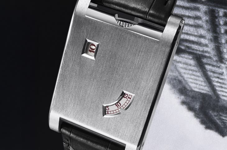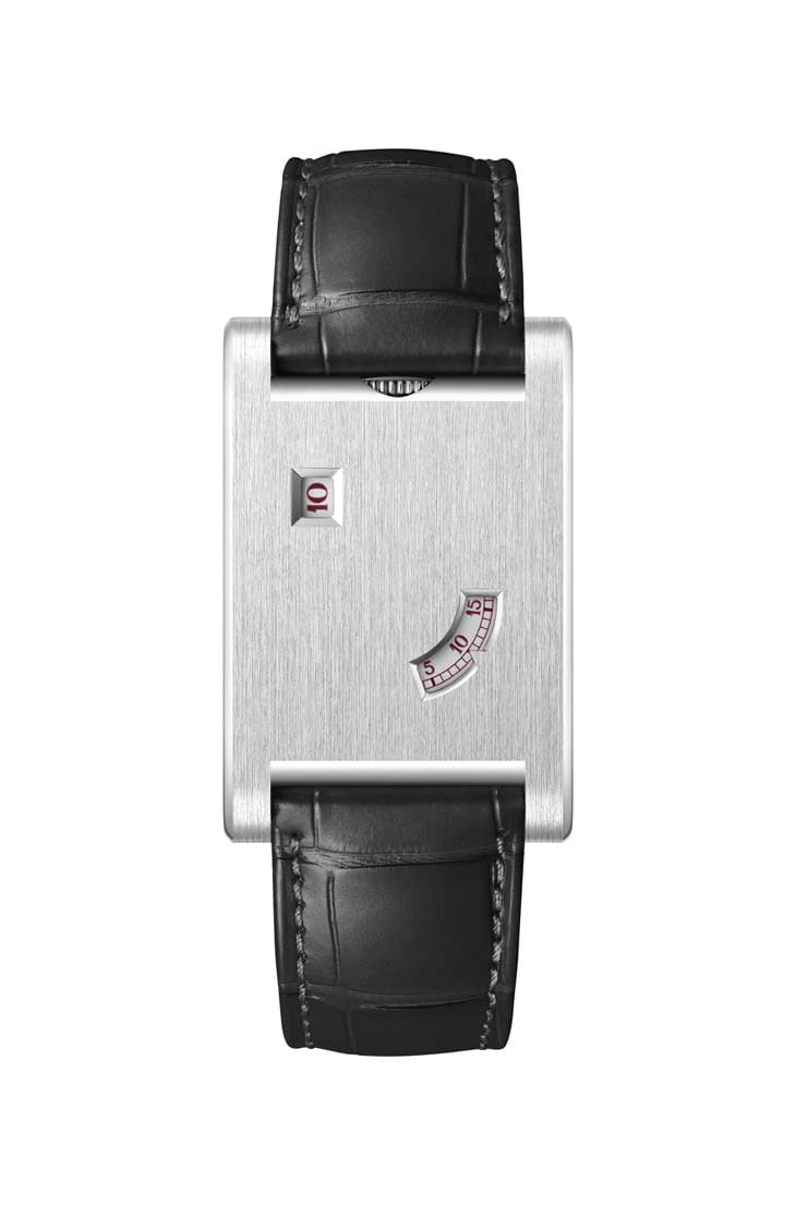 第一眼看到這只Tank à Guichets,你可能會懷疑它是不是哪個現代建築師設計的,整個錶面就是一片金屬牆面,沒有指針、沒有時標,連面盤都被取消,只留下兩個視窗,10點方向顯示小時、4點方向顯示分鐘。這樣的設計幾乎是極簡主義的化身。錶殼尺寸為37.6x24.8mm,厚度僅6mm,比例纖長而優雅。鉑金殼經垂直拉絲處理,表面有細緻的緞面光澤,線條俐落。兩個視窗的邊緣由工匠手工拋光,讓金屬表面在光線下閃出柔和反射,數字採印刷設計,這個版本以深紅色字樣對應黑色皮帶,彰顯紳士優雅品味。時間的呈現方式同樣值得玩味,上方的跳時盤每小時瞬間跳動一次,象徵時間的斷裂與節奏感;下方的分鐘盤則是逆行式連續運作,指針走到終點後迅速回彈,帶來視覺上的韻律感,錶冠位置設於12點方向,是對1928年原版設計的直接致敬,也讓整體比例更具雕塑感。
