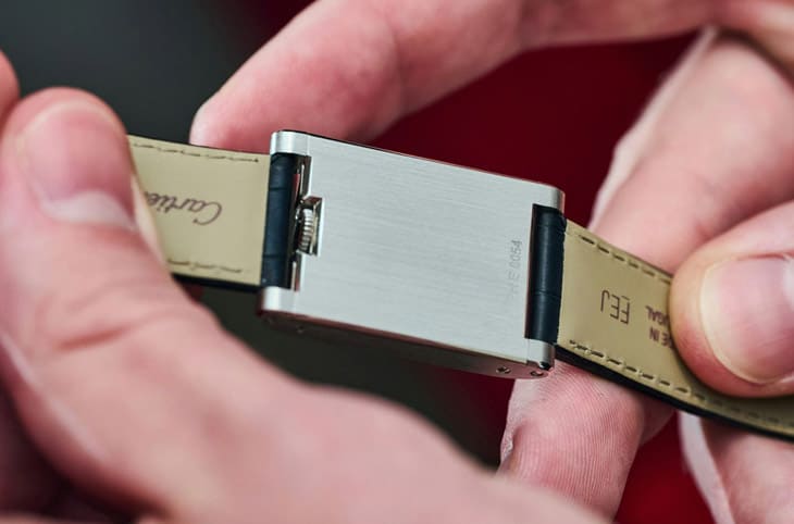 Tank à Guichets之所以能達到這種極簡又精準的顯示,背後的關鍵在於它搭載的9755 MC手上鍊機芯,這枚機芯以伯爵著名的超薄430P為基礎,由卡地亞工坊重新設計並整合跳時與逆行機構,整體厚度僅2.1mm,是手錶能維持纖薄設計的重要原因。9755 MC的震頻為21,600次/小時,動力儲存約43小時,它專為Tank à Guichets設計,特別是跳時瞬跳的穩定性與逆行結構的可靠度,都經過嚴格調校。由於這款錶主打極簡外觀,卡地亞選擇實心底蓋設計,不展示機芯,但這反而強化了整體的神祕感。對卡地亞而言,美學從來不是裝飾,而是一種結構性的設計語言,機芯的存在,是為了成就時間的節奏與表面上的「靜」,這樣的組合,讓Tank à Guichets不只是歷史復刻,更像一場對機械與美學之間平衡的哲學思考:在卡地亞的世界裡,真正的奢華不是繁複,而是懂得留白。