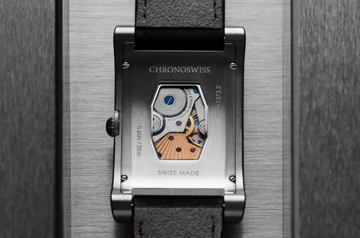 C.85757手上鍊機芯是手錶心臟,3Hz頻率帶來穩定跳動,約48小時動力儲存中規中矩,結構上是以基礎機芯搭配 CHRONOSWISS自主研發的Digiteur模組,完美管理瞬跳小時所需能量,確保分盤與秒盤平滑運作。機芯內部採用 Incabloc避震裝置與Nivarox I游絲,透過藍寶石底蓋可見精美裝飾,例如鍍金輪橋的手工機刻雕花、環形緞面棘輪、鍍銠零件及放射狀日內瓦波紋,展現細膩工藝。