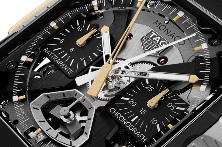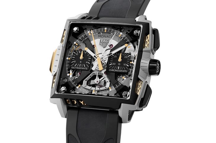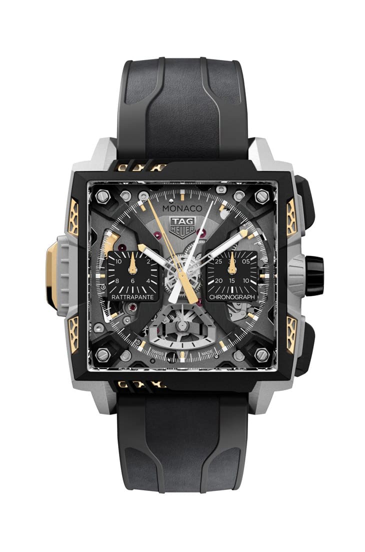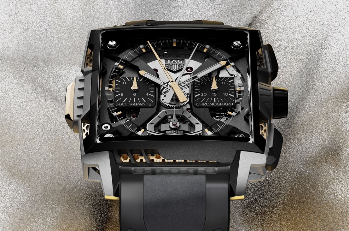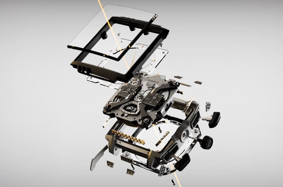 錶款的設計靈感來自超跑引擎蓋與進氣口,41mm錶殼呈現出如雕塑般的外骨骼感,線條緊湊且具有侵略性,錶殼兩側可見沙面鈦金屬格柵,而錶圈下方的格柵則以雷射切割的2N黃金製成,內部雖包含純金零件,但透過SLM技術與輕量化鈦材,整只錶僅重85公克,佩戴時幾乎感受不到負擔。視覺上呈現鏤空效果,黑色DLC鍍層的錶圈與倒角更增添科技感和力量感,而且手錶的防水性能同樣維持30米水準,比照其他Monaco雙追針系列成員辦理。Air 1搭配黑色橡膠錶帶,頂部插入Alcantara麂皮片,呈現濃厚賽車風格,黑色DLC 5級鈦金屬蝴蝶扣,有著提升佩戴穩定性的考量,手錶整體造型充滿速度感與力量感,即使靜止於腕上,也能感受到超跑引擎般的張力。