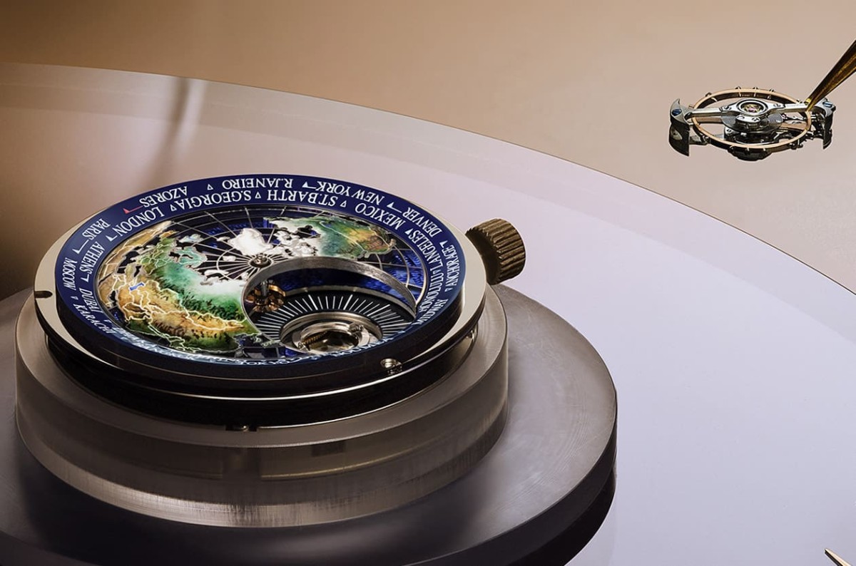 ▲Master Grande Tradition Calibre 948首度結合世界時間與陀飛輪,後者每24小時環繞面盤一圈,並以內填琺瑯和精緻扭索漆藝描繪立體地球。