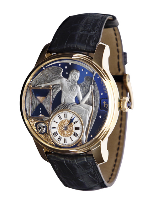 掌管時間之神 克勒諾斯(Ancient god-Chronos),這次它將會出現KONSTANTIN CHAYKIN 的新錶款之中,且將是以立體微型金雕的模式呈現於錶盤上,看來這次的作品,又更具特殊性及話題性了, 這是來自俄羅斯的發明家康斯坦丁.查依金KONSTANTIN CHAYKIN製錶廠的創始人設計的手錶,它不僅僅是一個手錶 – 同時也是一件藝術品。康斯坦丁將它命名 :及時行樂(拉丁語為:佔領天)。
