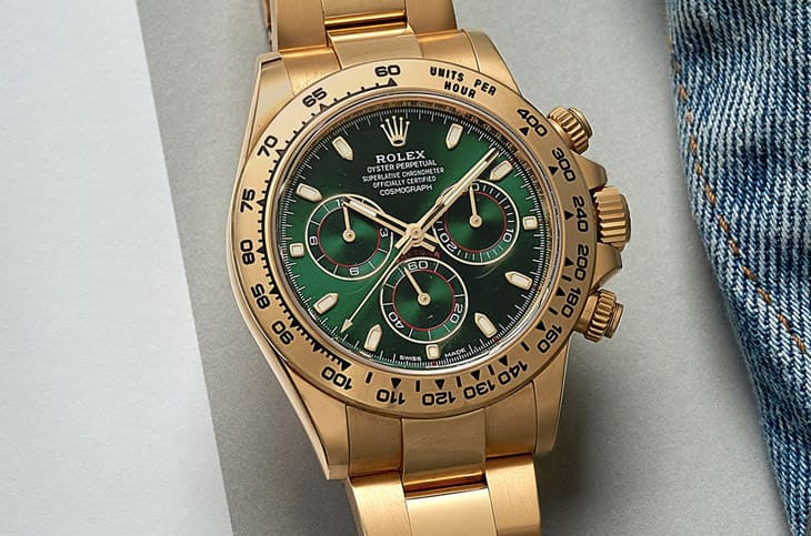 如果說Hulk代表運動錶領域的綠色巔峰,那麼黃金綠面Daytona 116508則是貴金屬領域的絕對王者。這款手錶採用 18K黃金打造,面盤呈現濃郁而深沉的綠色,被形容為賽車綠、英國綠或聖誕樹綠都恰如其分,它與Hulk那種會流動的綠色不同,呈現的是霧面、低調卻濃重的質感,整體調性介於運動錶與高級珠寶之間,看似華麗,卻不失一種競速精神。