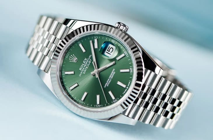 近年最受普羅收藏者矚目的綠色樣式,莫過於Datejust的薄荷綠,這種綠色介於粉彩與明亮之間,清新又具輕盈感。它比Hulk的綠色更溫柔,也比橄欖綠更現代,因此非常容易搭配各種穿著風格。薄荷綠Datejust有一種「一戴就成主角」的魅力,但又不會過度搶戲,這是它迅速竄紅的原因,許多人甚至視它為傳統白面Datejust的「新一代日常配色」。此外,薄荷綠「棕櫚葉紋」(Palm Motif)面盤也值得一提,利用雷射蝕刻呈現植物紋理,是勞力士難得展現活潑風格的嘗試,雖然這種變體已停產,但因獨特外觀與數量不多,現在仍是被市場悄悄追逐的款式。
