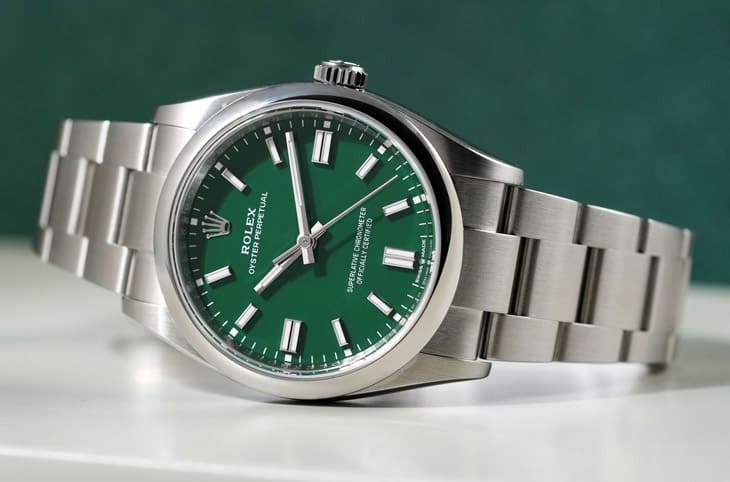 2020年,蠔式恒動Oyster Perpetual系列回歸亮色漆面,是勞力士近年最成功的市場操作之一,這些顏色靈感來自 1970年代Stella漆面面盤,而綠色版本無疑是其中最亮眼、也最具收藏潛力的代表。漆面綠的特點在於飽滿、平整、具有強烈視覺衝擊,它不像放射紋面盤那樣玩細節,而是以「純色」取勝,這種配色成功讓OP不再只是乏味的入門款,而是一款具有風格、個性的時尚手錶。目前因為市場需求大,漆面OP實際二級市場價格遠高於原廠定價,通常落在 7,000~9,000美金(約合台幣22萬~28萬)之間,它向市場證明,即使是最基礎的勞力士系列,只要搭配正確的顏色,也能成為熱門款。