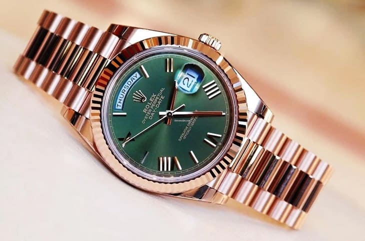勞力士擅長讓同一種顏色擁有多種性格,若說綠色在運動錶領域是張揚與強烈,那麼到了正裝錶領域,它展現的則是成熟、細膩甚至奢華的不同層面。例如玫瑰金Day-Date 40的橄欖綠,是市場長期熱議的代表作,這個面盤在2016年推出,用以紀念Day-Date 60週年,它的綠色帶著大地色調,比Hulk的綠色沉穩許多,適合作為正裝錶的呈現方式,它與永恒玫瑰金殼相互襯托,形成柔和而高級的色彩表現。對收藏家而言,橄欖綠Day-Date不只是顏色美,而是象徵一種品味選擇:成熟、穩定、但仍保有細緻個性。