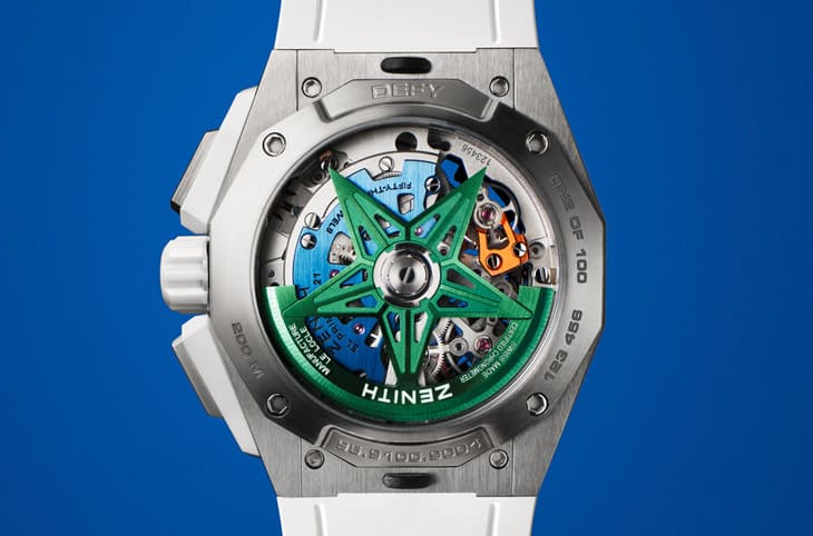 驅動這場色彩與性能盛宴的核心,當然就是真力時旗下最具代表性的El Primero 9004自動計時機芯,這枚機芯是目前市面上唯一能測量至1/100秒的量產機械機芯,靠的是雙擒縱系統的分工,其中一組以5Hz維持日常走時精準,另一組則以高達50Hz的震頻專責1/100秒計時功能。當佩戴者啟動計時後,中央計時針會以每秒一圈的速度在面盤奔馳,肉眼幾乎跟不上其行進軌跡,正是El Primero技術地位最直觀的證明,機芯擁有約50小時動力儲存,而高耗能的計時模組也能獨立運作近50分鐘,足以支援絕大多數極限情境。